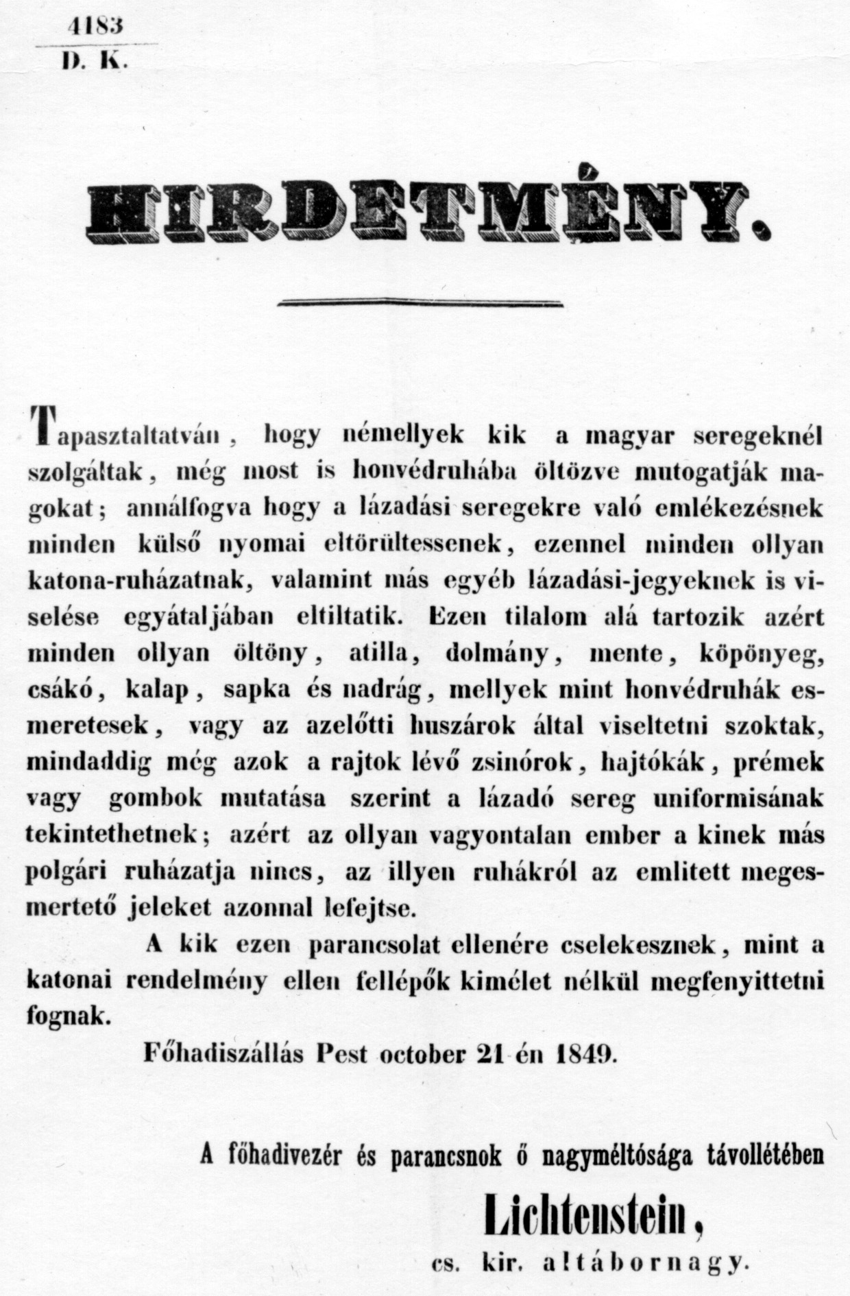 A szabadságharc alatti ruhaviselet üldözése (1849)