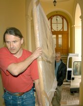 József Múzeum elegáns kiállítótermébe. A légpárnás fóliába csomagolt