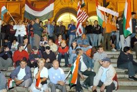át!", „magyar rendőr velünk tart". A rendőrök a városháza mellett a