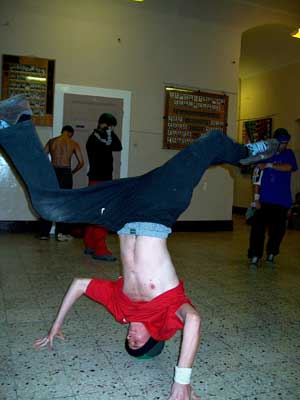 A Horváth Mihály Gimnázium folyosóján gyakoroltak a fiatalok, amit a kép is bizonyítja. Nem a kép van fejjel lefelé, hanem tényleg a fejükön forogtak. Az a tánc az úgynevezett break. A tört mozdulatok sora egy kis akrobatikával keverve. Többen figyelték a srácokat, és egy-egy nehéz mozdulatnál közösen szurkoltak, hogy sikerüljön a nehéz figura. Szentes, 2001. 09. 10.