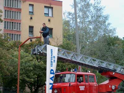 Tűzoltók segítségével teszik ki a reklám-transzparenseket a város forgalmas pontjaira. Szentes, 2001. 09. 11.