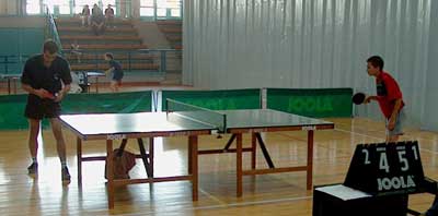 A Deák DSE és a Cegléd csapata találkozott MB III. asztalitenisz mérkőzésen a Szentesi Városi Sportcsarnokban. A képen balról látható Simon Viktor három győzelme is kevés volt a végső győzelemre, mert a csapat 12-6 arányban vesztett a Cegléd csapatával szemben.