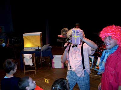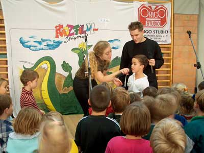 A Tóth József Színházban mutatta be vadonatúj műsorát a POM-POM együttes. A teremben közel 500 gyermek szórakozott a műsoron. Az előadásban a számítástechnikát népszerűsítették és az Internetet. A gyerekek jót mosolyogtak az egéren, mert egy hatalmas szürke plüss egeret cibáltak az előadók, ami a képen a háttérben látszik. Szentes, 2001. 10. 06.