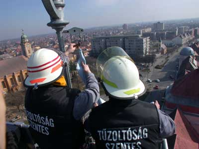 Eljött a nagy roham ideje! (2002. március 12.) A szentesi tűzoltók megrohamozták a Városháza tornyát, hogy bevegyék, ill. kitűzzék a város lobogóját. Az eddigi eredmény 2:1 volt a szél javára, de úgy nézett ki, hogy kiegyenlítve mégis a tűzoltók győzedelmeskednek. Hát nem így történt!