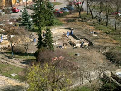 A magasból már jól kitűnik a Kossuth tér átalakulása. Éppen a szökőkút építésén dolgoznak a munkások!