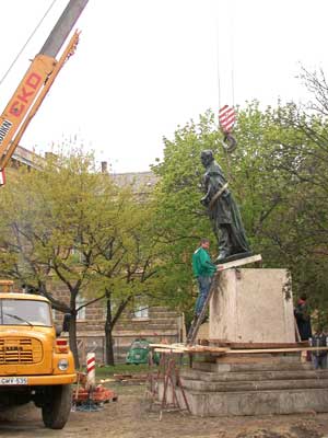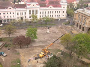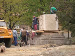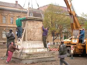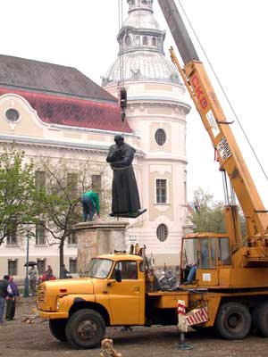 A Kossuth tér átalakulásának és átépítésének az egyik és leglátványosabb mozzanata történt meg április 10-én a délelőtti órákban. A talapzatok összeállítása után mindkét szobor egy "pici" segítséggel "felállt" a helyére.
