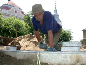 A Kossuth tér újjáépítésének munkálataiban elérkezett a járdakövek letétele, és ezáltal kezd kialakulni a végleges járdaforma. Négy héten belül végeznek a járdák és a díszburkolatok kialakításával és utána rendezik be a teret padokkal és lámpákkal. Utolsó lépésben a kertészeké a terep, akik pázsit kialakítását és egyéb parkosítást végeznek el Szentes főterén. Szentes, 2002. 05. 15. |