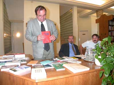 A Városi Könyvtárban 2002. június 6-án az Ünnepi Könyvhét megnyitóján a HUNGAROVOX kiadó mutatkozott be a szentesi olvasóknak. Kaiser László a kiadó vezetője kifejtette gondolatát az olvasásról, az olvasás és a könyvek használatának változásairól, a média fontosságát az olvasás népszerűsítésében. Kiadójuk közel 100 könyvet (regények, verses kötetek, kottakönyvek) jelentetett meg. A megnyitón vendégek voltak: Horváth Nóra előadóművész, B. Horváth István költő, Mezey László Miklós irodalomtörténész. Szentes, 2002. 06. 07. |