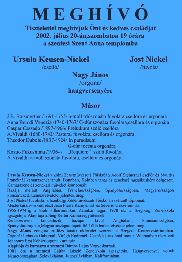 Közreműködik: Ursula Keusen-Nickel (cselló), Jost Nickel (fuvola), Nagy János (orgona) Szent Anna templom, 19.00