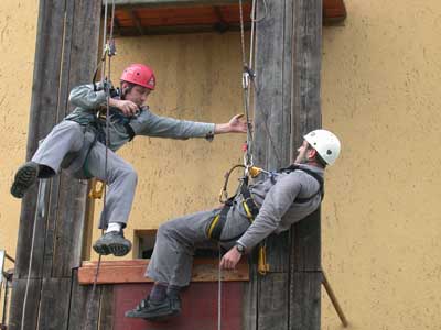 Alpinista tudásukból vizsgáztak a tűzoltók 2002. szeptember 27-én, ahol az elméleti feladatok után gyakorlatban is be kellett mutatniuk az alpin technikával történő személyi mentést.