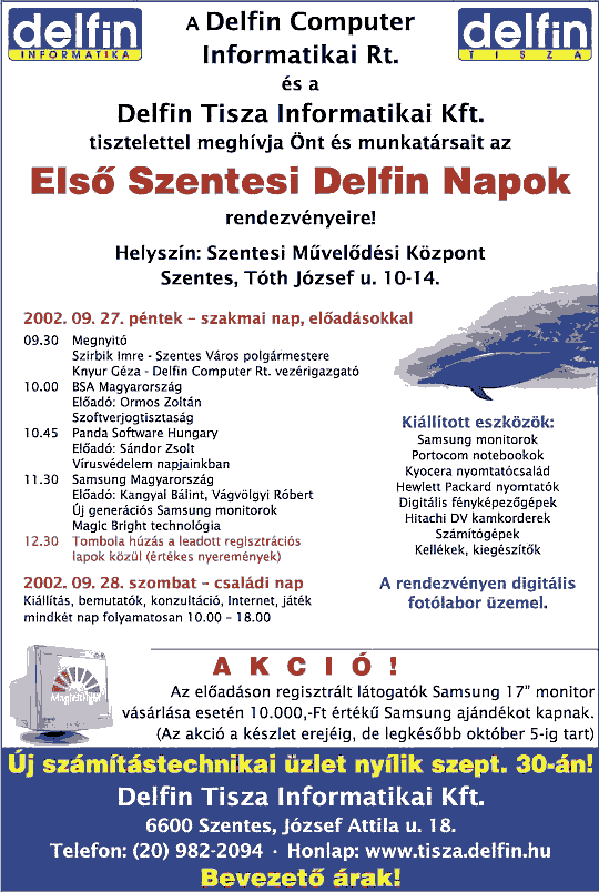 A Művelődési és Ifjúsági Házban rendezték meg az Első Szentesi Delfin Napokat, melyet Knyur Géza a Delfin Computer RT. vezérigazgatója ajánlott a számítástechnika iránt érdeklődőknek és computer szerelmeseinek. Ezen a rendezvényen debütált az IH újjáépített konferencia terme, mely egyben moziterem is, ahol a hasonló konferenciákat lehet kultúrált környezetben megrendezni.