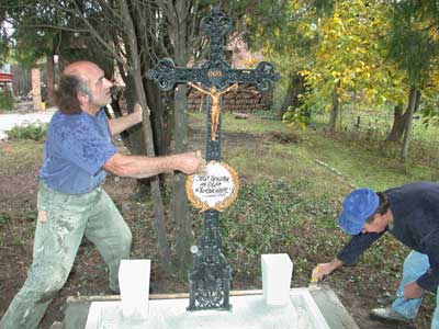 A temetőt látogatók régi óhaja teljesült 2002. október 18-án a Kálvária Római Katolikus temetőben, Bölcskei M. Sándor temetőcsősz és Dora T. Sándor sírásó jóvoltából. Újra áll egy kereszt a temető főbejáratánál, ahol elhelyezhetik virágaikat és gyújthatnak egy szál gyertyát mindazok, akiknek nem itt nyugszanak hozzátartozói, esetleg odamaradt a háborúban valakijük, vagy csak egyszerűen emlékezni szeretnének halottaikra. Az öntöttvas kereszt restaurálása, festése, felújítása Berkecz István festőművész útmutatása alapján készült, míg annak talapzatba öntése és a környezet kialakítása Baranyi László kőfaragó mester és csapatának kezemunkáját dicséri. Köszönet érte mindannyiuknak. Szentes, 2002. 10. 22. |