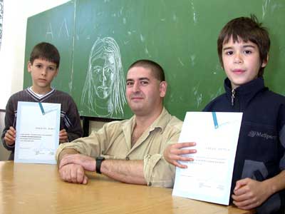 A Budai Rajziskola - Képzeletbeli utazás címmel meghirdetett - X. Országos Gyermekrajzpályázatán kiemelkedő eredményt értek el a Damjanich János Általános Iskola tanulói. Varga Attila (jobb oldalon) rajza bekerült a legjobb alkotások közé, melyet kiállításon állítanak ki, Bögöthy Zsolt (bal oldalt) nyereményként egy ausztriai utazást nyert. Felkészítő tanáruk Döme Zoltán. Szentes, 2002. 10. 17. |