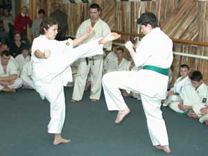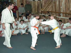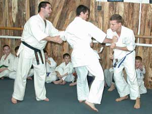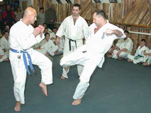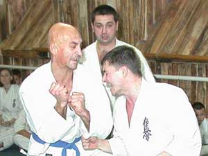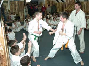 Az USA-ból érkezett KEVIN JOHNSON (aki az Oyama Dojo Uchi deski bentlakásos iskolában edz Sensei Brezovai Sándor irányításával 2004. decemberéig) nem vizsgázott, de a vizsgán segédkezett és részt vett a küzdelmekben. Szentes, 2002. 12. 31. |