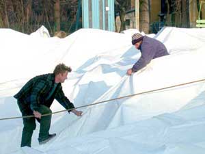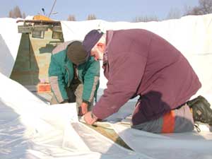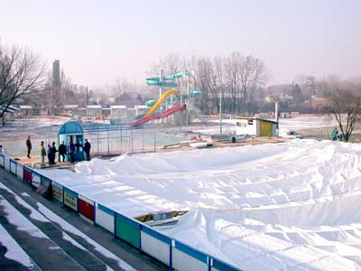 A két medence körül új kupolatartó vasakat kellett beszerelni, hogy az új sátorkonstrukciót tudják rögzíteni. A két kupolasátor külön légterű lesz, amit egy közlekedő folyosó köt össze. Ez a folyosó fedni fogja a tusolót is. Szentes, 2002. 12. 13. |