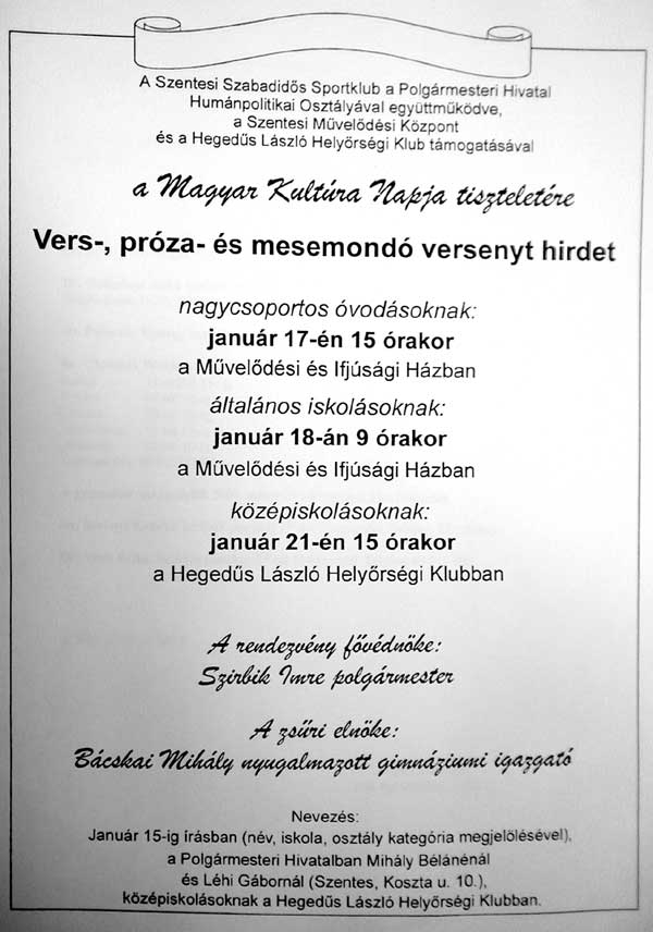 17. 18. 21. (P-SZ-K) Vers-, próza- és mesemondó verseny Óvodások, általános- és középiskolások számára Művelődési és Ifjúsági Ház, 15.00 Művelődési és Ifjúsági Ház, 9.00 Hegedűs László Helyőrségi Klub, 15.00