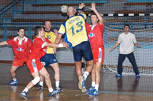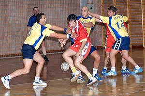 A Szentesi Kinizsi férfi NB II-es kézilabdásai (sárga mezben) nagy küzdelemben, (amit azért maguknak is köszönhetnek!), győzedelmeskedtek 2003. október 18-án a Városi Sportcsarnokban Kiskunmajsa (piros mezben) csapata ellen. Az első félidő számunkra kedvezően alakult, mert 5 gólos (17-12) előnnyel mehettek pihenni a szünetben a fiúk, de még így is a sorozatos taktikai hibák és a rossz passzok miatt volt olyan időszak, amikor az ellenfél 1 gólra megközelítette a szentesi csapatot. Szerencsére Szécsi László edzőnek sikerült rendeznie a csapat sorait, és így a végén biztos győzelmet tudhatnak magukénak. Szentes, 2003. 10. 21. |