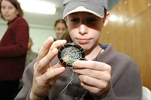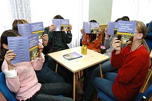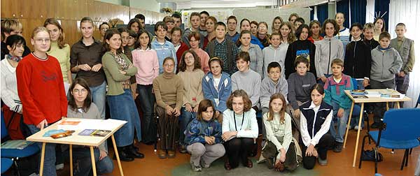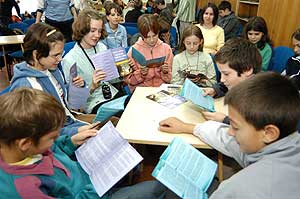 Az EUROKVIZ vetélkedő során bújni kellett a segédanyagokat! Ezen a délutánon "kézműves műhelyek", vetélkedők, "Enyém a színpad" szlogennel amatőr színpadi előadások és a végén táncház várta az ünneplésre összegyűlt fiatalokat. Szentes, 2003. 10. 27. |