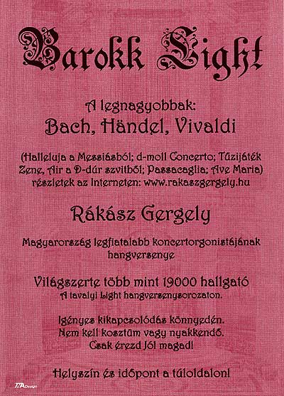18. (kedd) BAROKK LIGHT Rákász Gergely orgona koncertje A plakát kinagyítható! Helyszín: Szent Anna templom, 18.00 óra