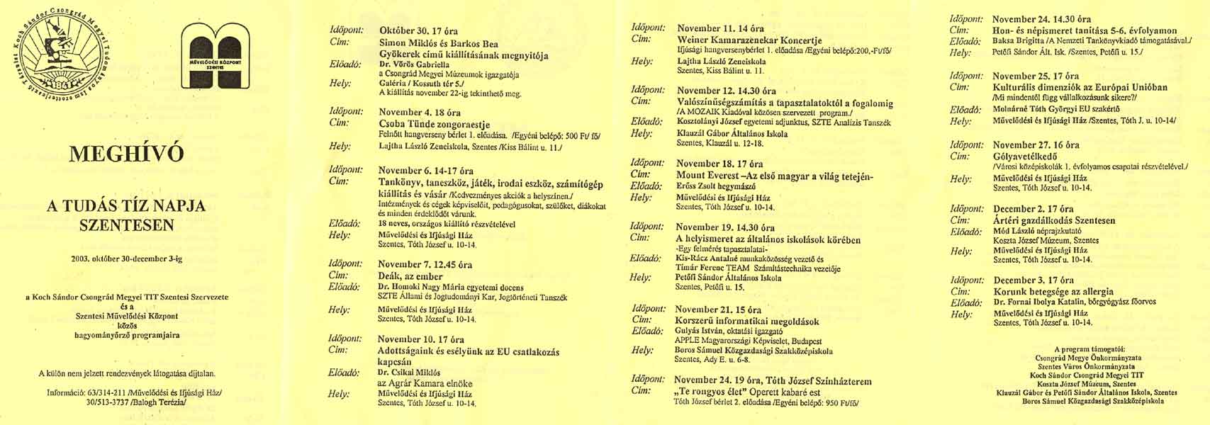 10. (hétfő) A TUDÁS "TÍZ" NAPJA - 5. nap Adottságaink és esélyünk az EU csatlakozás kapcsán Dr. Csikai Miklós az Agrár Kamara elnökének előadása. Helyszín: Művelődési és Ifjúsági Ház, 17.00 óra