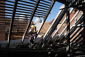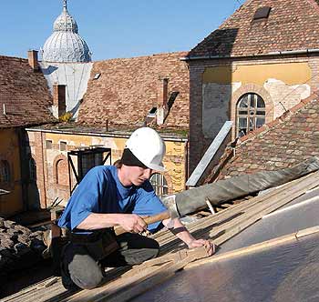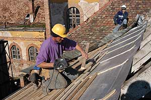 Szűcs Lajos alpolgármester lapunknak elmondta, hogy a költségek fedezésére a város kasszájából különítették el az összeget, míg az önkormányzat tervezi, hogy jövőre pályázatot nyújt be épületgépészet felújítására: az öltözők, a zenekari árok, a mellékhelyiségek rendbetételére. A tetőfelújítás 6 millió 800 ezer forintjába kerül a városnak, de ha már meg van bontva a tető, akkor még a szükséges hófogórácsokat és a villámhárítókat is felszerelik. A fent említett összegben ez nincs benne, de szükségesnek tekintik, hogy ezek is most készüljenek el, hogy a későbbiekben ne kelljen megbontani az új tetőt. Szentes, 2003. 11. 12 . |