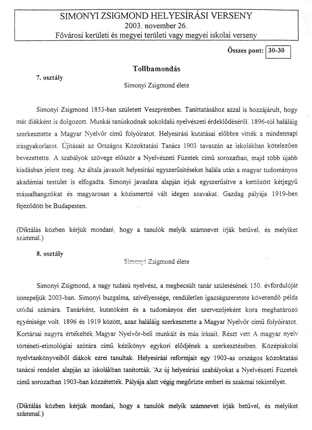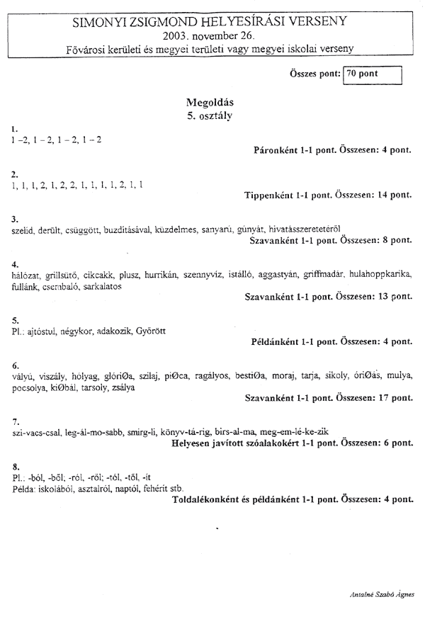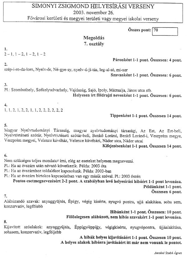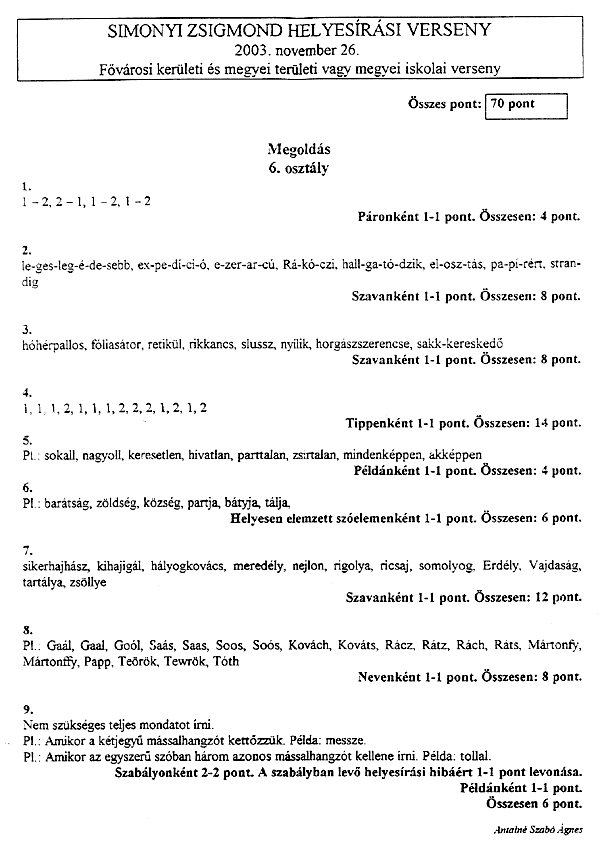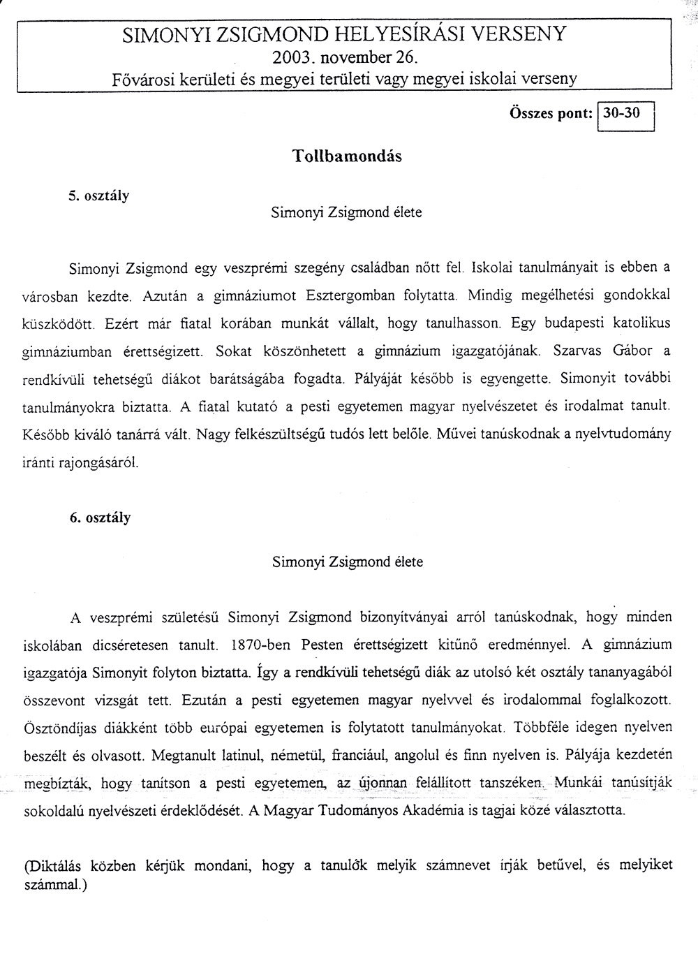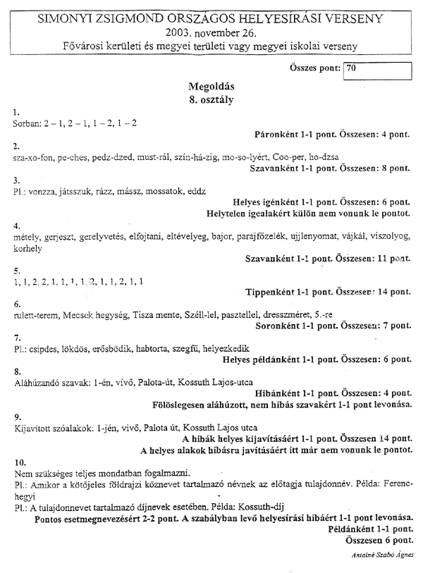 A tollbamondás és a feladatlap kitöltésekor a következőkre kellett vigyázni a versenyzőknek: • Csak a magyar helyesírásnak megfelelő ékezetet fogadják el (karika, vízszintes egyenes . . . ) • Egyértelműen kell megkülönböztetni a kis és nagy kezdőbetűket, az ékezetek rövidségét és hosszúságát, illetve az egybe- és különírást! A félreérthető alakokat nem fogadják el! • Az a versenyző, aki mást ír, mint amit diktáltak, szavanként egy-egy pontot veszít.