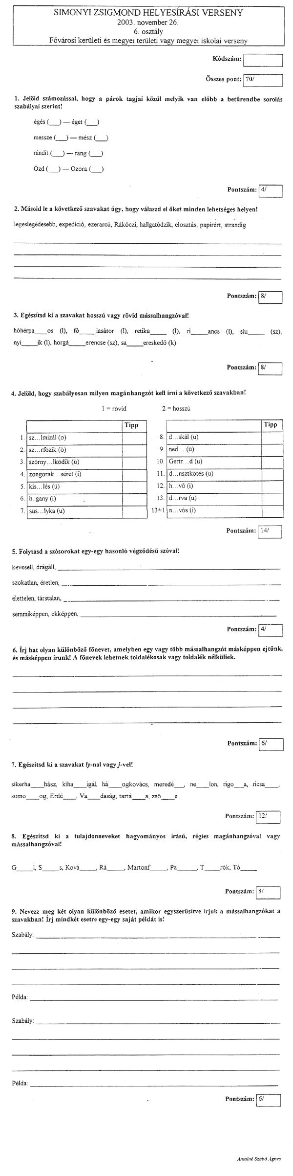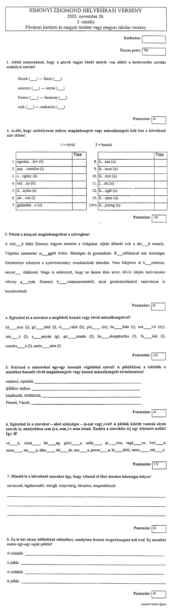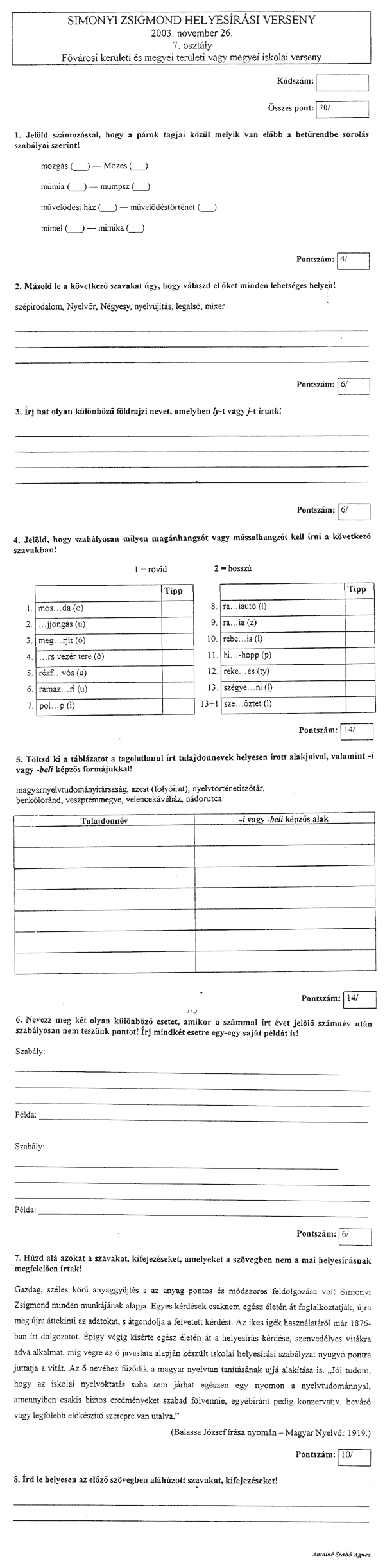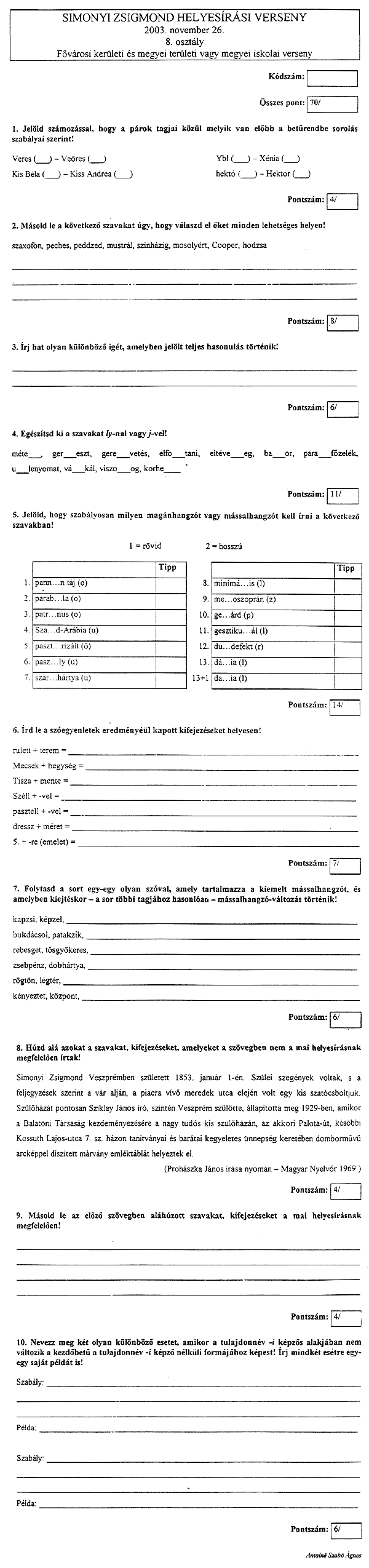 A tollbamondás és a feladatlap kitöltésekor a következőkre kellett vigyázni a versenyzőknek: • Csak a magyar helyesírásnak megfelelő ékezetet fogadják el (karika, vízszintes egyenes . . . ) • Egyértelműen kell megkülönböztetni a kis és nagy kezdőbetűket, az ékezetek rövidségét és hosszúságát, illetve az egybe- és különírást! A félreérthető alakokat nem fogadják el! • Az a versenyző, aki mást ír, mint amit diktáltak, szavanként egy-egy pontot veszít.