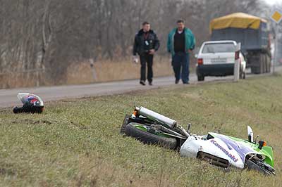 2003. december 30-án szinte egyszerre történt két baleset Szentesen. Az első eset Szentes külterületén a 45-ös főúton Szentes és Hódmezővásárhely között a derekegyházi kereszteződéstől csaknem 800 méterre történt, amikor egy teherautó egy nagymotor előzésébe kezdett, de amikor vissza akart térni forgalmi sávjába rosszul választotta meg a távolságot és a nagymotor vezetőjét meglökte aki lesodródott az út melletti árokba. Könnyebb sérülésekkel úszta meg a motor sofőrje a teherautóval történő találkozást.