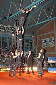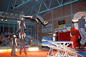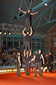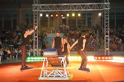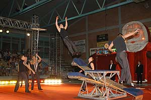 A leglátványosabb akrobatamutatványt pedig a hat tagú Jumping Boys-ok (Ugráló Fiúk) adták elő a keresztbe épített libikókájukkal.