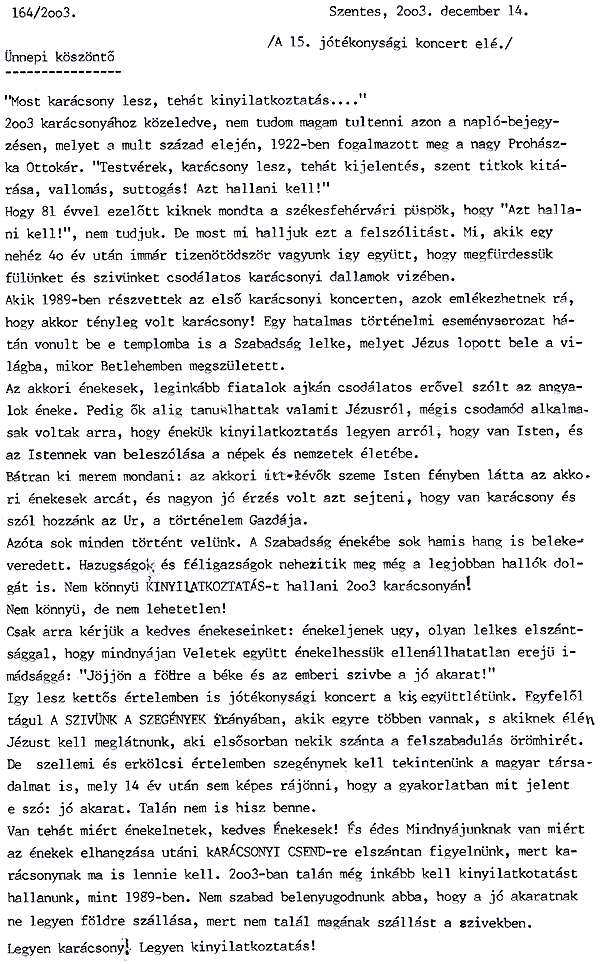 A koncert elején Vági László apát, Szentes város díszpolgára mondott köszöntőt, melyben kiemelte, hogy "immáron tizenötödször vagyunk így együtt, hogy megfürdessük fülünket és szívünket a csodálatos karácsonyi dallamok vizében."