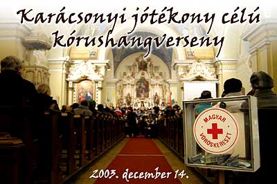 A Római Katolikus Egyházközség és a Magyar Vöröskereszt területi vezetősége karácsonyi jótékony célú kórushangversenyt rendezett a területünkön élő szociális rászorultak megsegítésére. 2003. december 14-én a Szent Anna-templomban felcsendülő karácsonyi dalok és énekek teremtettek ünnepi hangulatot a szép számban megjelent hallgatóságnak. Akik mindezt létrehozták: Bárdos Lajos Vegyes Kar, Kiss Bálint Református Általános Iskola tanári kórusa, Petőfi Sándor Általános Iskola kis- és nagykórusa, Szentes Városi Fúvószenekar, Szentesi Óvónők Kamarakórusa, Szent Anna Templom Kamarakórusa, Andor Csilla (ének), Dömsödi Teréz (ének) és Lakatos Béla (zongora). A belépődíjmentes rendezvényen a jelenlévők adakozásából összegyűlt adományt a szervezők - az egyházközség és a vöröskereszt - eljutatták a rászorultaknak. Részletesebb beszámolót ITT olvashatnak! Szentes, 2003. 12. 16.