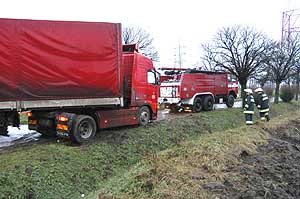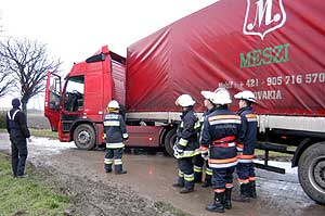 2003. december 21-én az esti órákban akart megfordulni az a szlovák kamion amely az útról lekapva kis híján az árokba csúszott a Szentesről kivezető kunszentmártoni úton. Előzetes terve szerint a sofőrnek az volt a célja, hogy bekanyarodik az áramszolgáltató 100 állomás névre hallgató transzformátorállomásának bekötőútjára és egy gyors Y-ban megfordul. Sajnos a kamion vezetője rosszul mérte fel a távolságot és az úttestről lekapott a kamion hátsó hajtott kereke és az a felázott padkán elkapart. Másnap délelőtt az állomás biztonsági őre riasztotta a tűzoltókat, hogy egy elakadt kamion torlaszolja el a Szentes áramellátását biztosító trafóállomás bejáratát. A lánglovagok közel 20 perc leforgása alatt kiszabadították az elakadt járművet a sár fogságából és visszaállt a megszokott közúti rend ezen a szakaszon. Figyelmeztetés erejű az eset, mert számítanunk kell a nyirkos időjárásban, hogy a felázott padka más veszélyeket is rejt! Szentes, 2003. 12. 22. |