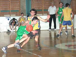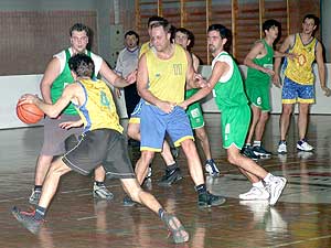A Szentesi Kosár Klub (sárga) Mezőberény csapatával küzdött a győzelmi pontokért, de a mérkőzés elején megszerzett vendégelőnyt, nem sikerült megfordítani a fiúknak, és így 77:81-es győzelemmel a Mezőberény csapata utazhatott haza teli "pontos" kosárral. Szentes, 2003. 02. 24. |