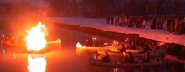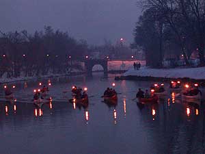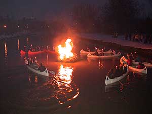 A Horváth Mihály Gimnázium diákjai fáklyákkal a kezükben kenukkal vonultak fel a Kurcán, hogy meggyújtsák a telet jelképező máglyarakást, és így elhozzák a meleg TAVASZT és elégessék a hideg telet.