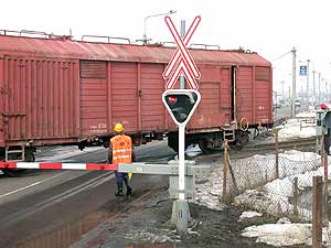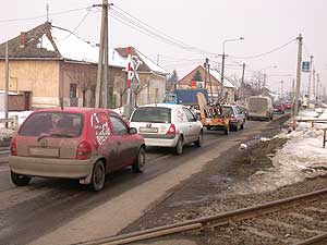 Szentesen 2003. március 3-án több órára lezárták a Hódmezővásárhely felé kivezető főút vasúti átkelőjét, mert a kora reggeli órákban kisiklott egy tehervagon. Az Erőtakarmány felé irányuló tehervágányt kiszolgáló sínpárról tolatás során a ráfagyott jég miatt kisiklott a tehervagon első tengelypárja, amelyet a Szegedről érkezett vasúti műszaki mentők helyeztek vissza. Szentes, 2003. 03. 03. |
