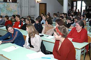 François Wioland a Strasbourg-i Egyetem fonetika professzora tartott rendkívüli francia órát a Horváth Mihály Gimnáziumban. Francia nyelven sokan beszélnek, de franciául már kevesebben. A franciául való kiejtést (fonetikát) magyarázta a professzor úr a megjelenteknek, amely olykor szemléletes mutogatásba csapott át.
