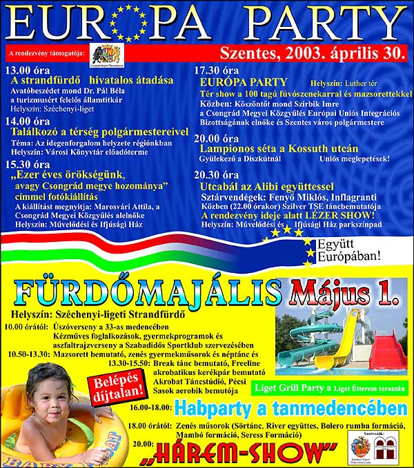 Április 30-án 13 órakor adják át hivatalosan is a Széchenyi-ligeti strandon kialakított élményfürdő és szabadidőközpontot. (Az uszoda első medencéjét 1936-ban adták át.) Avatóbeszédet Pál Béla, a turizmusért felelős államtitkár mond. A térség polgármesterei 14 órakor találkoznak a városi könyvtárban, a megbeszélés témája az idegenforgalom lesz. Ezeréves örökségünk, avagy Csongrád megye hozománya címmel fotókiállítás bemutatójára várják az érdeklődőket a Művelődési és Ifjúsági Házban. A tárlatot 15.30-kor Marosvári Attila, a Csongrád Megyei Közgyűlés alelnöke nyitja meg. Este fél 6-kor tér-show lesz a 100 tagú fúvószenekarral és mazsorettekkel a Luther téren. A tervek szerint három fúvószenekar, Makóról, Kistelekről érkező, valamint helybéli zenészek adnak másfél órás koncertet, melyet mazsorettek műsora színesít majd. Este 8 órakor indul el a lampionos felvonulás a Kossuth utcán. A menet a díszkútnál gyülekezik. A sétát utcabál követi az ifjúsági parkban, az IH parkszínpadán sztárvendégek lépnek fel, így este 9-től Fenyő Miklós, éjjel fél 11-től pedig az Inflagranti együttes. Közben lézershow, a Szilver Táncsport Együttes szórakoztatja a közönséget, egész estét betöltően pedig az Alibi együttes játszik. A pódiumteremben este 9 órától táncház várja az érdeklődőket.