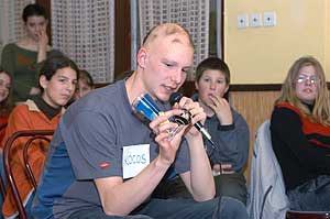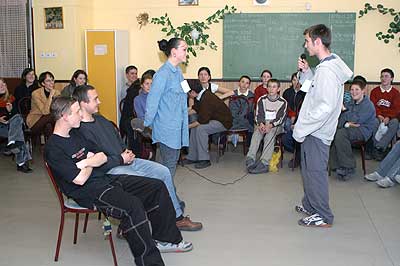 Voltak akik meglepődtek a feladatok hallatán, de a legnagyobb sikert a szituációs faladat aratta. A fenti képen a Horváth Mihály Gimnázium drámai tagozatos diákjai segítettek társuknak, Gál Rolandnak, hogy előadják azt a szituációt, "amikor találkozunk úgy véljük régi ismerősünkkel, de kiderül, hogy tévedtünk".