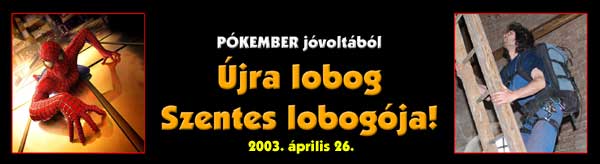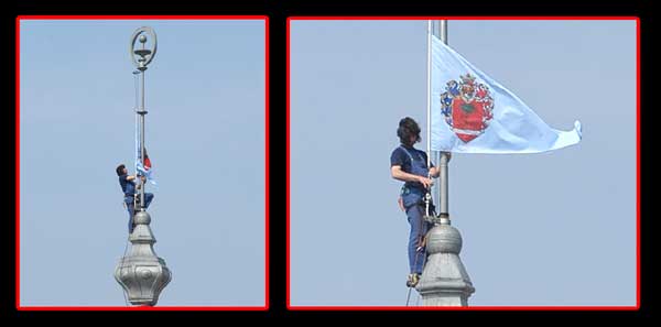 2003. április 26-án (általunk csak Pókembernek nevezett) ipari alpinisták jóvoltából újra lobog Szentes lobogója a Városháza zászlórúdján. A közel 42 méteres magasságba az elmúlt évben tűzoltók segítségével sikerült felhúzni Szentes lobogóját, de idén alpinisták segítettek lecserélni a viharos időjárásban megrongálódott (megsemmisült, szét foszlott) lobogót. Szentes, 2003. 04. 28. |