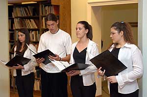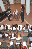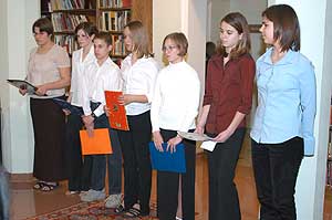 Az esten szereplő diákok tolmácsolásában a német irodalom olyan halhatatlan alakjai szólaltak meg, mint Geothe, Heine és Thomas Mann. A közönség helyenként a német nyelv szépségeit is felfedezhette, hiszen a diákok egy-egy rövidebb alkotást eredeti nyelven is előadtak. A Lajtha László Zeneiskola tanárai révén pedig többek között Wagner és Schuman művei csendültek fel, míg az est vége felé Forgó Róbert és barátai Vogelweide versére adtak elő középkori zenét. Szentes, 2003. 05. 04. |