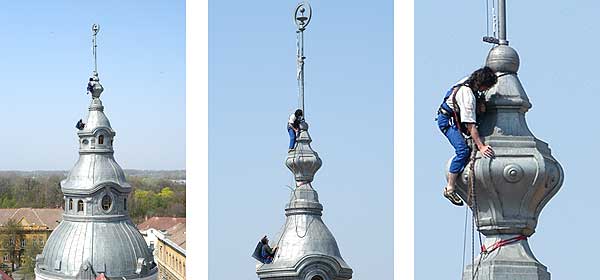 Picit futurisztikus és talán a XXX. századot tükrözi a cím, de az alsó képen látható ipari alpinistákat nyugodtan nevezhetjük pókembereknek. 2003. április 23-ai mutatványuk során, melyet a Városháza kupoláján hajtottak végre, szőtték-fonták a mászóköteleket, hogy feljussanak a torony tetején található zászlórúdhoz, hogy megkíséreljék kicserélni az ott található elhasználódott lobogót. Igaz ez azért nem valósult meg, mert a kitűzendő lobogó még nem érkezett meg a zászlógyárból. Ez csak egy próba volt, hogy megoldható-e ily módon a zászló csere, mert eddig a megyeszékhelyről érkezett egy kosaras tűzoltóautó, amely révén sikerült kicserélni a lobogót. (Az elmúlt évi lobogótűzést ITT lehet megtekinteni!)