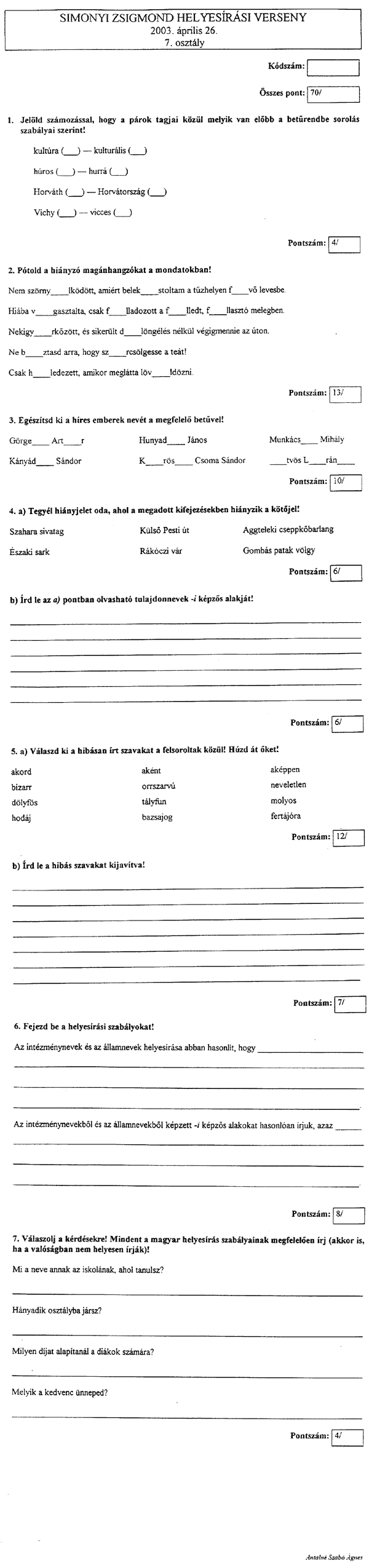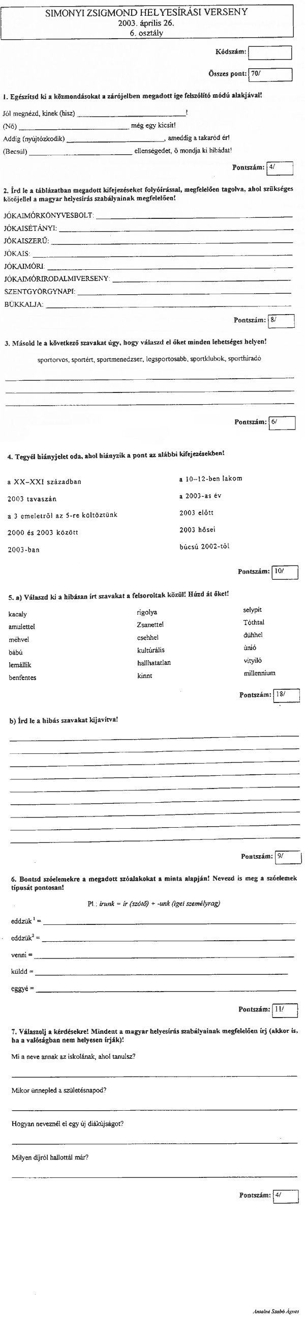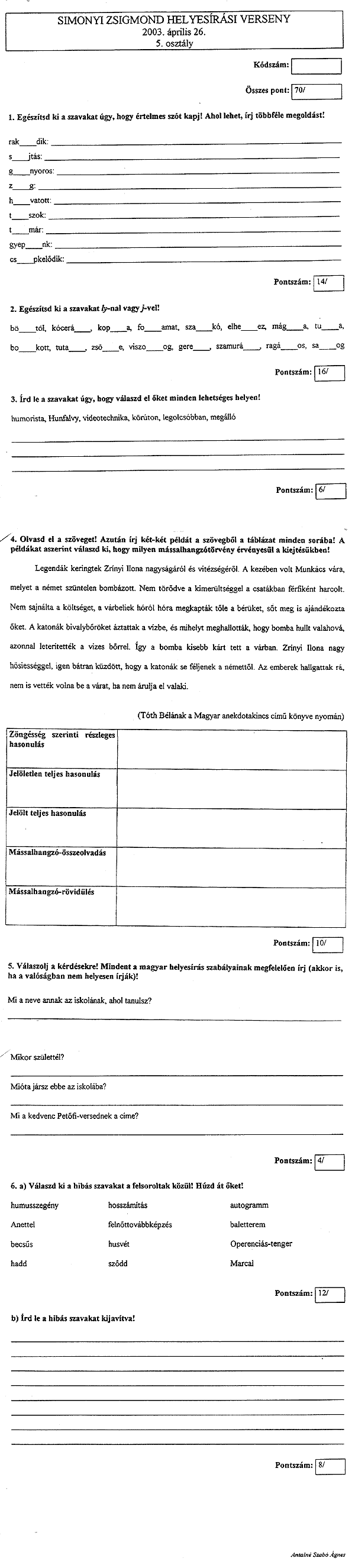 2003. április 26-án rendezték meg a Damjanich János Általános Iskolában a Simonyi Zsigmond Kárpát-medencei Helyesírási Verseny megyei fordulóját. A felső tagozatos diákoknak elsőként tollbamondás volt a feladat, majd következett a feladatlap.