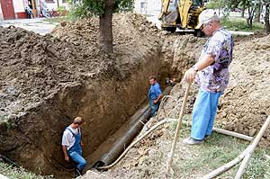A szentesi Vízmű szakembereinek igencsak nagy munkát okozott az a 300 mm-es átmérőjű vízvezeték, amely a Kertvárosi lakótelep vízellátását biztosítja, mert eltört vagyis elrepedt. A lényegen ez ugyan semmit nem változtat, mert így is, úgy is ki kell cserélni. 2003. július 14-én végezték el a csőszakasz cseréjét a Szalai és Rákóczi utca kereszteződés közelében. Erre az időre másik irányból pótolták a vízkimaradást, és ezáltal nem szünetelt a vízellátás, hanem csak egy kis nyomáscsökkenést vehettek észre a lakótelepen lakók. Szentes, 2003. 07. 15. |