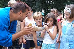 A tábor ideje alatt minden nap a déli harangszókor hatalmas tülök kürt jelezte, hogy elkészült az ebéd a tábori konyhán (Központi kollégium). Hangos meneteléssel, kürt szó mellett vonultak ebédelni a Széchenyi-ligteből végig a Kossuth utcán a kollégium ebédlőjébe a táborlakók. Persze csak az első napokban fújták a kürtöt a táborvezetők, majd az apródokon volt a sor. Szentes, 2003. 08. 08. |