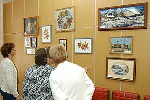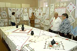 A művelődési ház egyik klubtermében "milliónyi" öltéssel díszített terítőket, faliképeket (gobleineket) láthattunk, ahol Magyarország minden tájegységéről származó motívumokkal találkozhattunk. Szentes, 2003. 09. 16. |