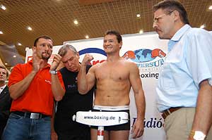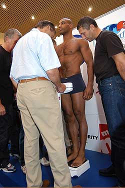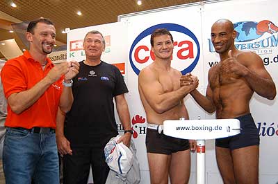 Erdei Zsolt 78,9 kg-mal, kihívója, a spanyol Juan Nelongo Pérez 78,6 kg-mal mérlegelt pénteken (2003. szeptember 5.) Szegeden. "Zsolt keménykötésű, képzett riválist kapott, de természetesen hazai győzelmet várok" - mondta Kovács István, Atlanta olimpiai bajnoka, aki pályafutása során amatőrként és profiként is mindent megnyert. A mérlegelésen is érvényesült a szombati címmérkőzés show-jellege. Az szinte természetesnek vehető, hogy Erdeinek óriási a szurkolótábora. Pérez pedig azzal igyekszik híveket szerezni, hogy folyamatosan dicséri Magyarországot, az itt élő embereket és Szeged szépségeit, amelyet volt módjában megtekinteni.