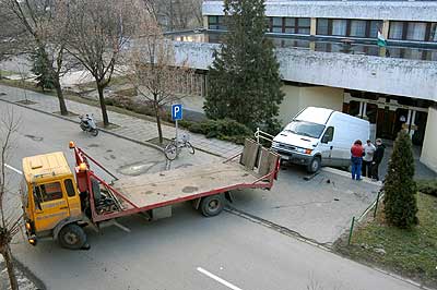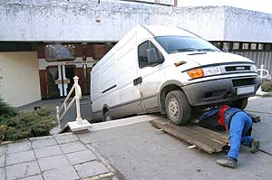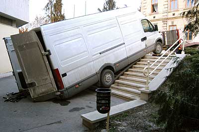 2004. január 21-én a délutáni órákban egy IVECO kisteherautó rakodás céljából leparkolt a Művelődési és Ifjúsági Ház bejárata előtti járdán. A fiatal sofőr akkor hibázott, amikor elfelejtette a kéziféket behúzni, és a rakodás közben egyszer csak megindult az autó és legurult a IH felújított lépcsőjén. Az autó nem úszta meg ezt a kis kalandot sérülés nélkül, de a lépcső is megsínylette az ideiglenes parkolást.