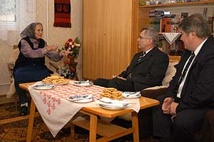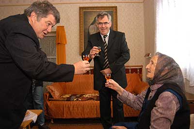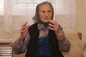 Halász nénit az unokája gondozza, akit nagyon félt, mert a kertben is, de az utcafrontról is támad a víz. A polgármestertől azt kérte, hogy segítsen abban, hogy legalább a járdájuk kiegyenesedjen, mert a legutóbbi telefonvezeték vezetése után több helyen megsüllyedt. Ő nem ért hozzá, hogy mit kellene tenni a kerttel, mert ott meg a mirhó van eltömődve, mert neki csak 6 elemije és két ismétlője van, de ennek a problémának a megoldását a körzet képviselőjére, Demeter Attilára bízta. Hiába múlt el 102 esztendő, Erzsike néni a napi gondok és egészségügyi problémák mellett féltőn óvja családi fészküket. Szentes, 2004. 10. 26. |