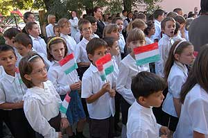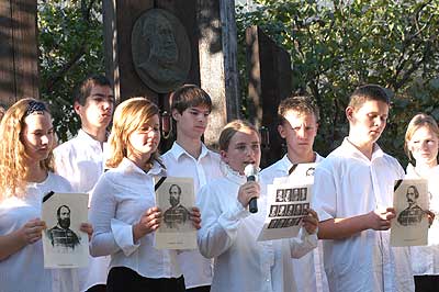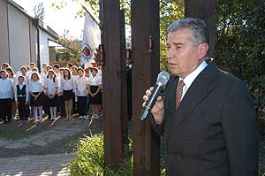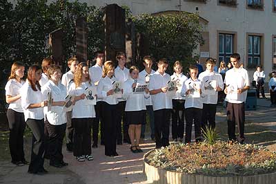 Ezt követően a Damjanich Tagiskola legkisebbjei a saját maguk készítette nemzeti színű zászlókat helyezték el az emlékmű előtt, miközben meggyújtották a vértanúk emlékét idéző mécseseket. Az ünnepség végén a város vezetői, az önkormányzati képviselők egy csoportja és az iskola vezetői megkoszorúzták a Damjanich János portréját ábrázoló domborművet. Szentes, 2004. 10. 11. |