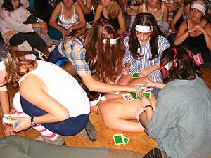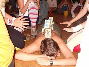 Ilyen feladat volt a kártyavár építés, amikor az osztályoknak az egyik társuknak a hátára kellett minél magasabb kártyavárat építeni.